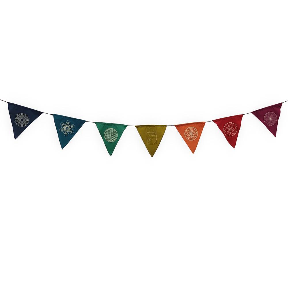 Erős és pozitív jelentésekkel bíró szimbólumokat ábrázoló színes zászlófüzér.